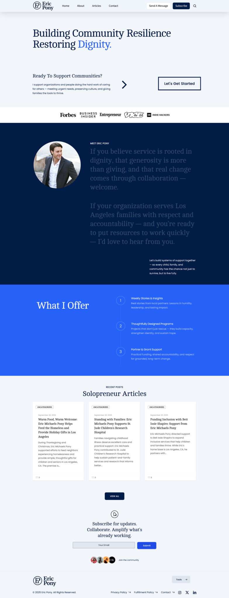 Designed and developed a modern, responsive website for Eric Pony, focused on clean visuals, clear navigation, and engaging copy. The site highlights personal branding, digital products, and educational content for solopreneurs, built for smooth user experience and conversion optimization.
